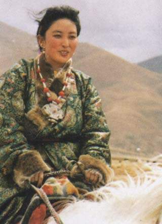 Tibetan women are beautiful and know how to dress themselves up. Peasant girls living along the Yarlung Zangbo River wear sleeveless black tweed robes with red, white or green shirts inside. They wear colorful tweed aprons about their waists and sumba boots on their feet. Their black hair is braided with colorful silk threads and then coiled on the top of their heads, making them look fresh, beautiful and gentle.