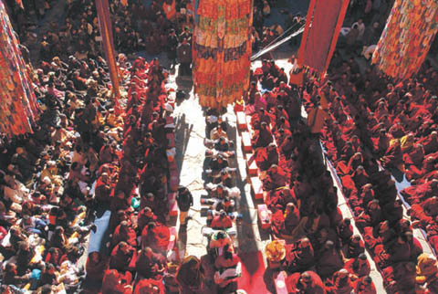 At 10 in the morning, the 11th Panchen Erdeni came to the courtyard amid the din of horn and suona horns blowing. All the monks present recited sutras and prayed for his long life. Cupping their hands in front of them, lay Buddhists also prayed for the young master.