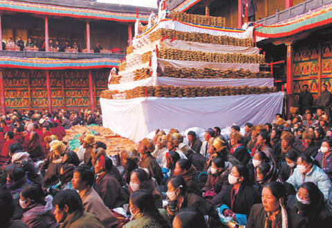 The Dorgyia Countyard where the ceremony was held was freshly adorned, with a pagoda composed of fried dough, dried nuts, qingke barley and wheat rising seven meters high. Photo by Jorgo.
