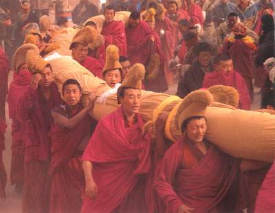 The Labrang Monastery holds seven large-scale summons ceremonies a year. They include the Summons Ceremony in the first lunar month and the Buddhist Doctrine Explaining Pitual in the seventh lunar month. The Summons Ceremony lasts from the evening of the third to 17th day. During this period, the monks recite Buddhist scriptures six times in the Grand Sutra Hall while the Prince of Dharma Dance is performed and the Butter Lamps Festival is held. The Buddhist Doctrine Explaining Ritual held in the seventh lunar month starts on the eighth day. During this period, monks of the monastery gather seven times for lectures or debate on Buddhist doctrines. The monastery's dance group performs a drama that shows how the Holy Monk Milha Riba wins over Goinbo Doje, a hunter. The performance, held in the square of the Grand Sutra Hall, is accompanied by drums and cymbals from the monastery's monk band. The 1st Living Buddha Jamyang, the first abbot of the monastery, organized a monk dance group and a monk band, introducing music from Tibet. Later, the group learned to perform music popular with the imperial court of the Qing Dynasty in the hinterland. The band performs Riwoze'a (Wutaishan Mountain) and Eternal Rejoice, a Qing court music. The monastery dance group also performs Songtsan Gambo and Princess Wencheng, Chimaigendain, Prince Norsang, Zholwa Sammo and Tubo King Trison Detsan.
